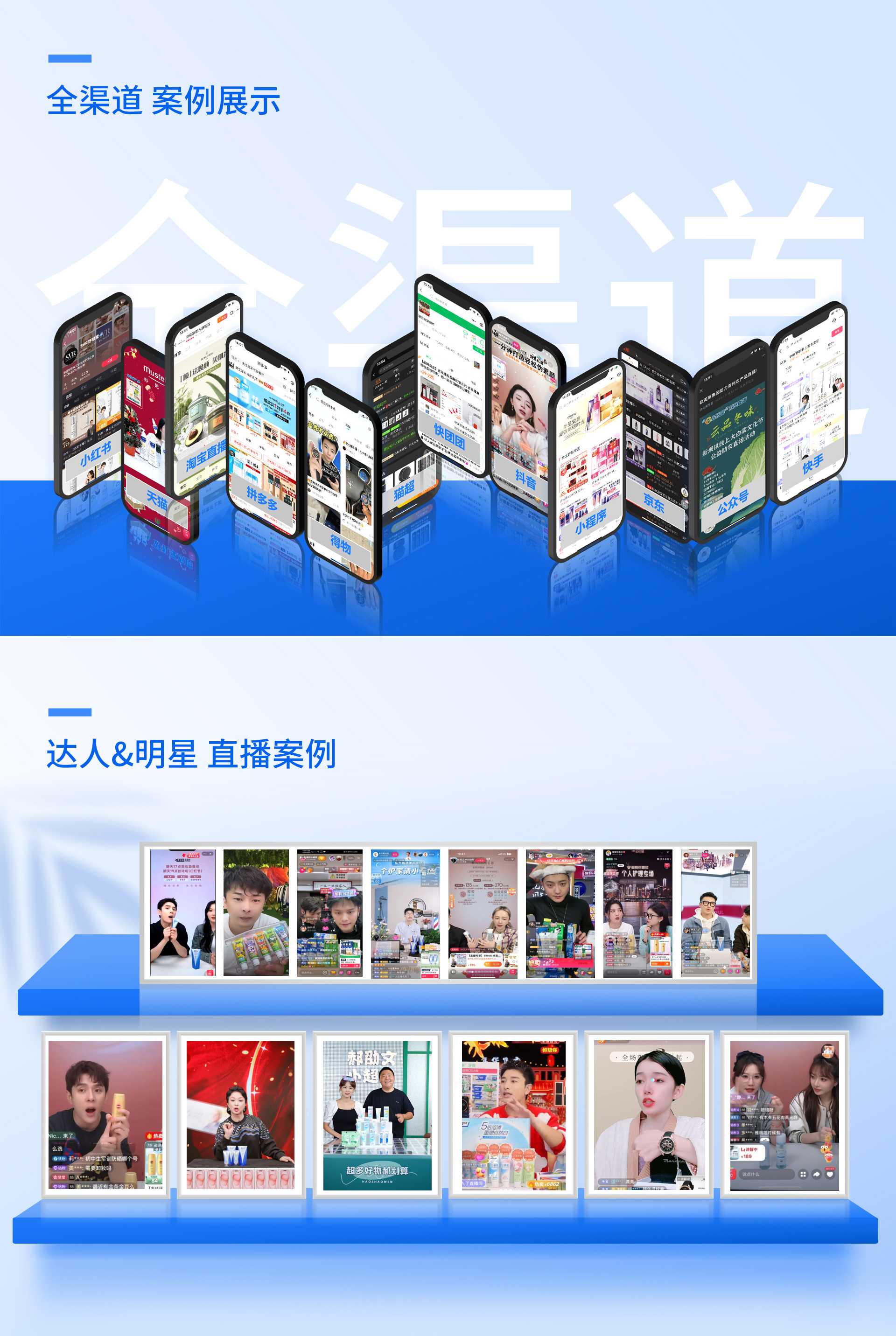 覆盖淘宝、天猫、京东、拼多多等传统电商,抖音、快手、得物、唯品会、私域团长、兴盛优选、平安好医生等垂类社交电商平台及线下商超渠道。